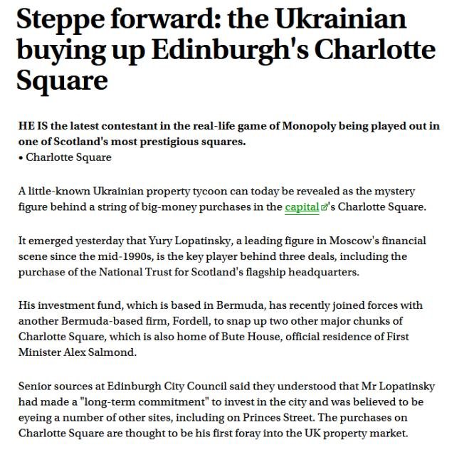 The Scotsman reported on "the publicity-shy businessman" Yuriy Lopatinskyy in 2010 relating to his property interests in Edinburgh including the buildings in Charlotte Square either side of the First Minister of Scotland (perfect for any bugging).
