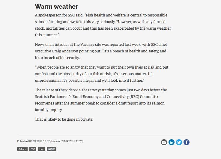 - Herald/Ferret: "Scottish Salmon Company chief hired investigator to 'snoop' on fish farming critic"