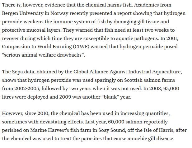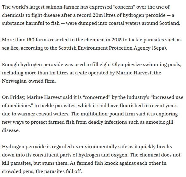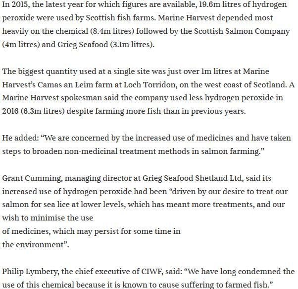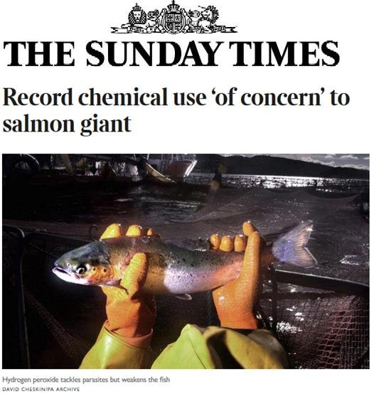 The Sunday Times: “Record chemical use ‘of concern’ to salmon giant” February 12, 2017 The Sunday Times reported (12 February 2017): Read more via: Press Release: "Sky-Rocketing Chemical Use on Scottish Salmon Farms" Press & Journal: "Scottish salmon farming ‘fighting a losing battle’ against sea lice" The Times: "Toxic war on salmon lice soars 1,000%" Press Release: Scottish Salmon's Lethal Legacy The Sunday Times: "Salmon industry toxins soar by 1000 per cent"