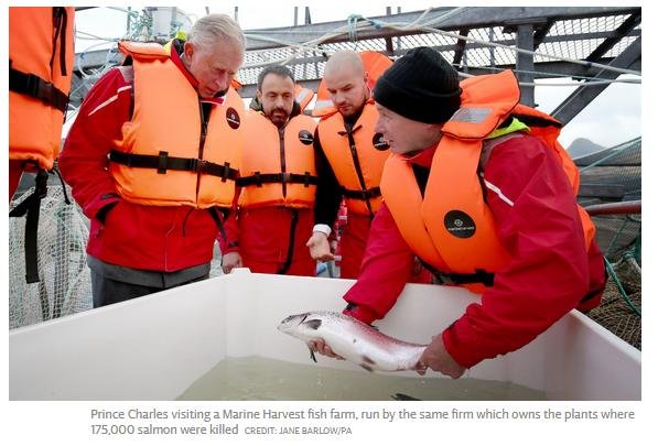 Prince Charles, the patron of the Atlantic Salmon Trust, would be there at the launch but I think he's busy having lunch with Marine Harvest at one of their lice-infested salmon farms on the West coast of Scotland.
