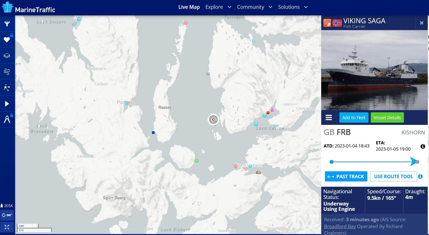 As of 6pm on 5 January 2023 (according to Marine Traffic), the Viking Saga (Aquaship) was near Loch Carron: