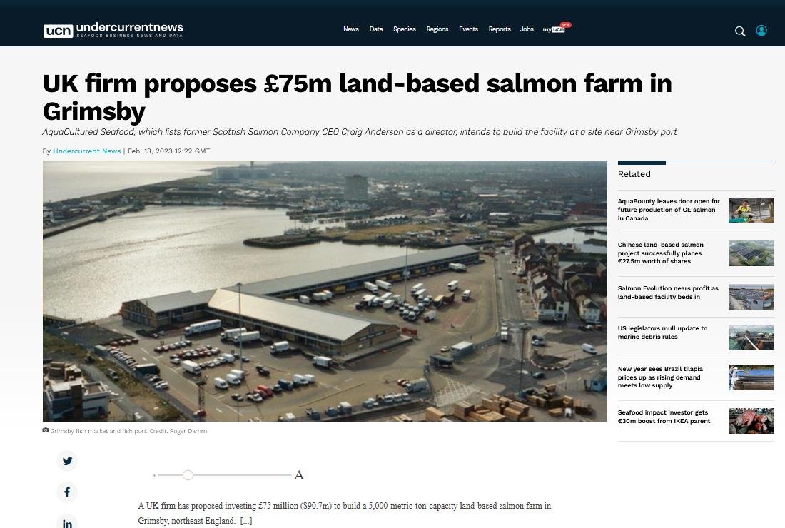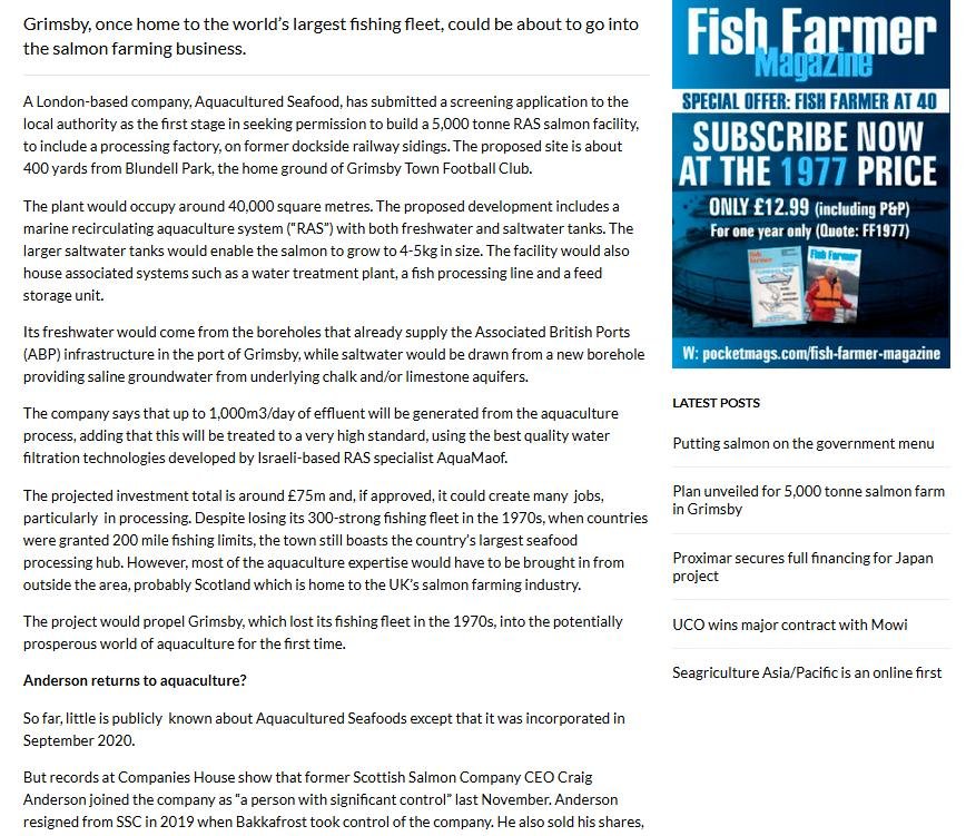 The news (first reported yesterday by $camon $cotland) that AquaCultured Seafood is planning to site the UK's largest salmon farm next to Grimsby Football Club has made waves in the trade press with reports in Fish Farmer, The Fish Site, Undercurrent News, Fish Farming Expert and Intrafish.