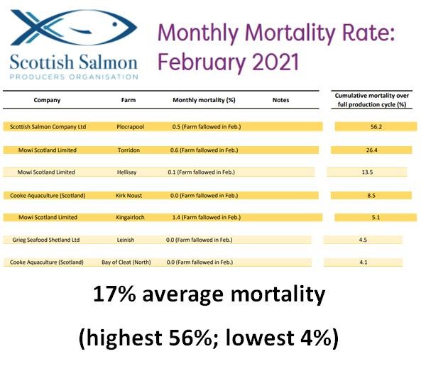 January and February are traditionally very quiet months for mortality on salmon farms (the lull after the Xmas frenzy and lower water temperatures meaning less disease). But some salmon farms have harvested out during February 2021 (the latest data currently available via the Scottish Salmon Producers Organisation) revealing shocking levels of mortality at The Scottish Salmon Company's Plocrapool salmon farm (56.% cumulative mortality – that means more than half the farmed salmon died during the sea cage phase of production) and at Mowi's Torridon salmon farm (26.4% cumulative mortality – that means one in every four farmed salmon died during the sea cage phase of production).