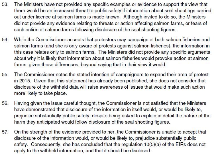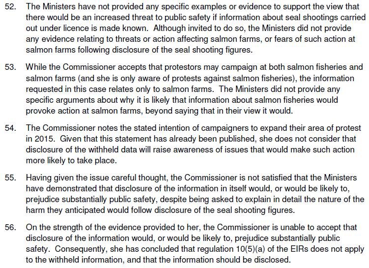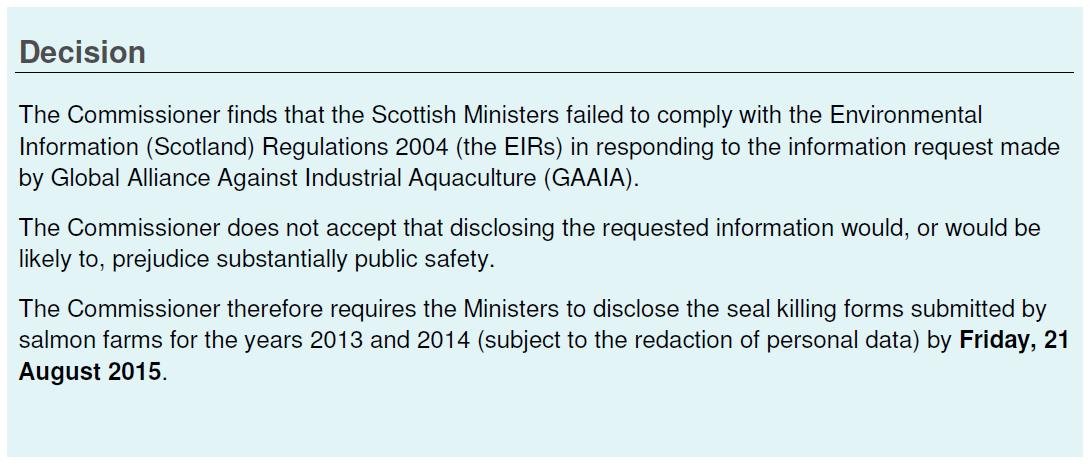 The Global Alliance Against Industrial Aquaculture has scored a notable victory with two decisions published today by the Scottish Information Commissioner (SIC). In both cases, the SIC has ordered Scottish Ministers to disclose damning seal-killing data in relation to salmon farms by 21 August 2015 (the SIC is required, by law, to give the Ministers at least six weeks to disclose the information).