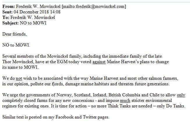 - Say No Way to MOWI – Shareholders urged to vote against Marine Harvest name change