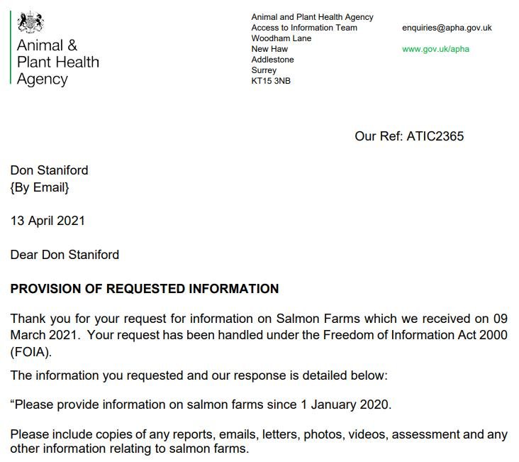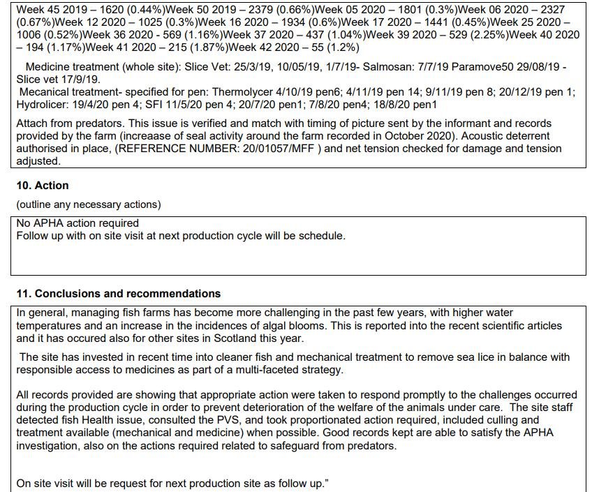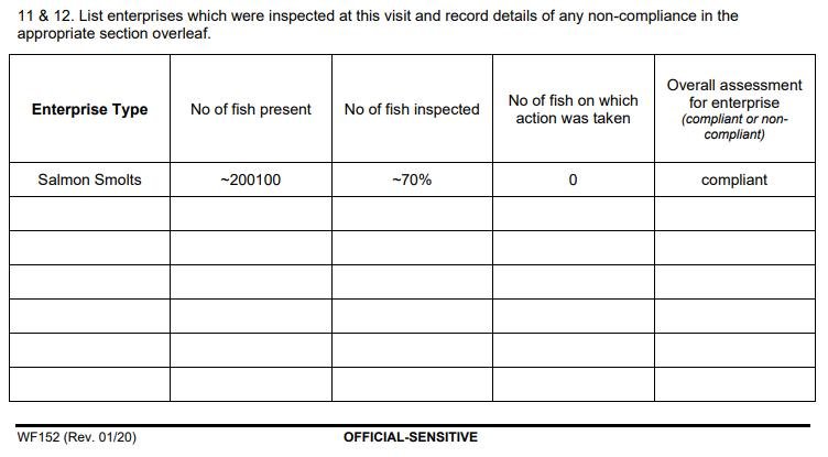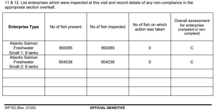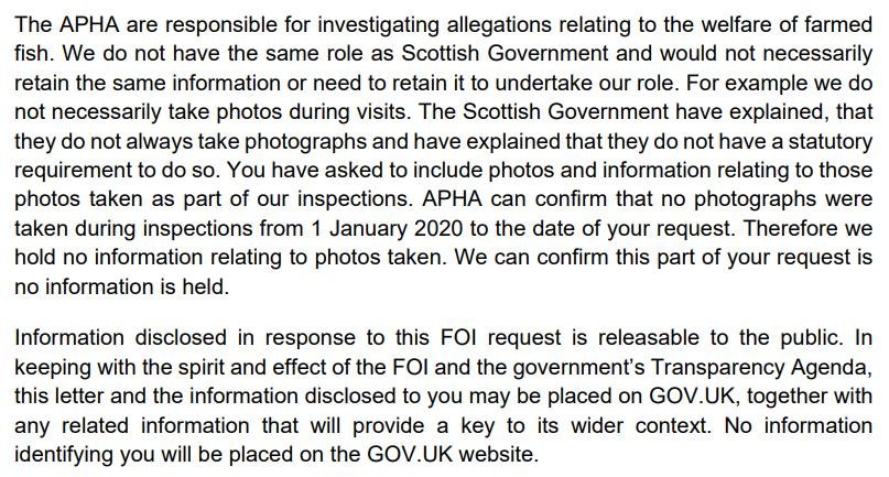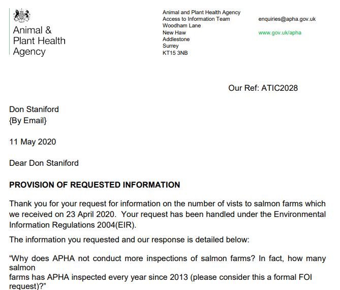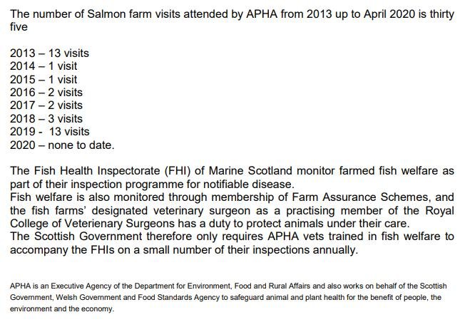 A FOI reply from APHA dated 20 November 2020 even claimed that "APHA have carried out no inspections" of salmon farms since 1 May 2020.