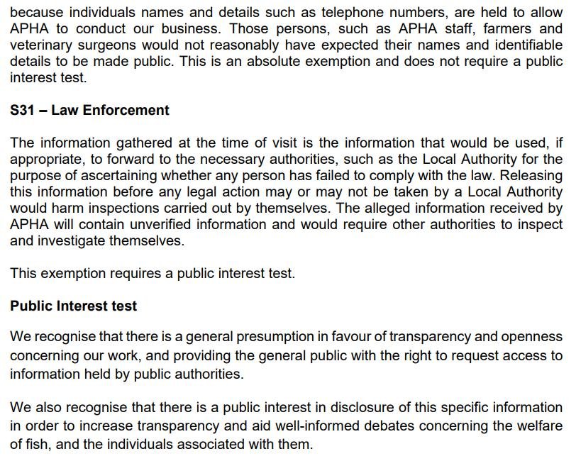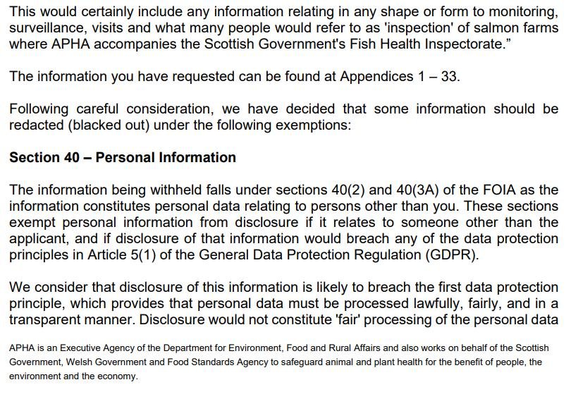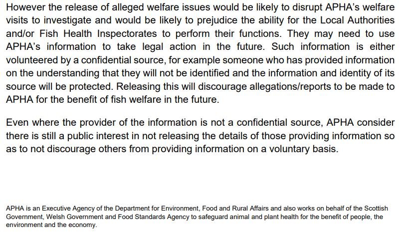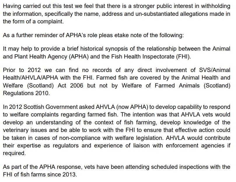 Scottish Salmon Watch will be filing a FOI review request asking APHA to provide all the information requested including the heavily redacted reports and complaints concerning welfare abuse on salmon farms.  Here's APHA covering letter dated 13 April 2021 explaining their reasons for censorship.