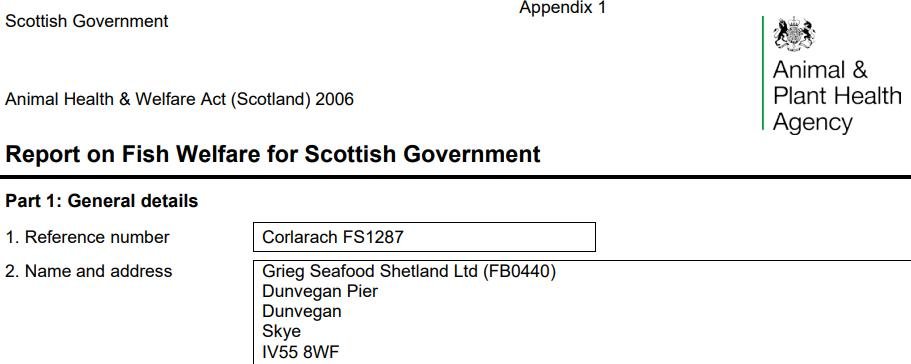 The Scottish Government's Fish Health Inspectorate conducted a 'Passive Surveillance Inspection' of Grieg Seafood in Loch Dunvegan in July 2020.