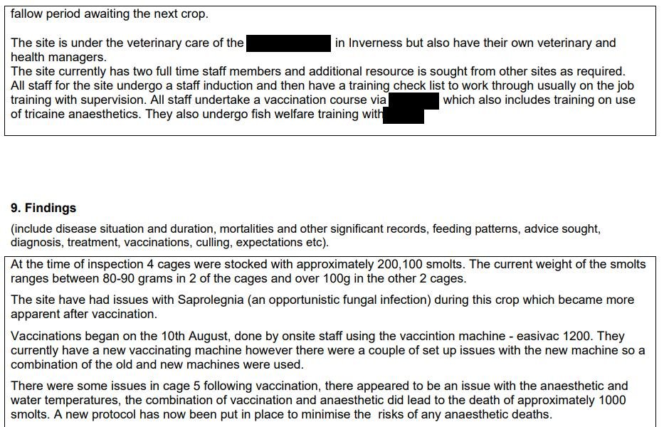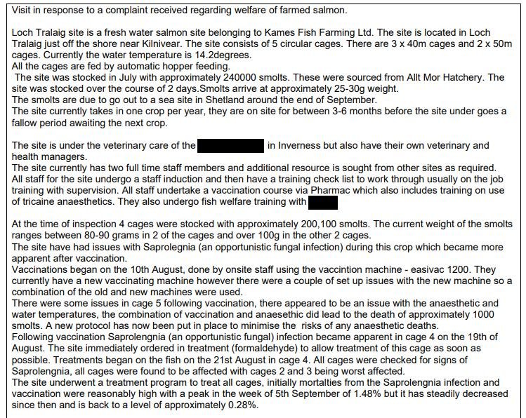 I would show you more but the others are all whitened out blank space with a tiny black square in the middle.  Scottish Salmon Watch understands – from video footage and photographs which were published last year – that the information redacted by APHA included evidence of welfare abuse in Loch Creran 'Special Area of Conservation'.