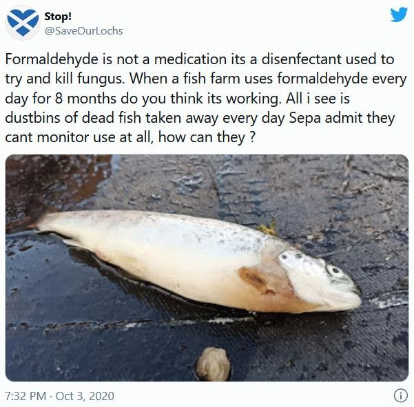 A 'Report on Fish Welfare for Scottish Government' dated 22 October 2020 detailed disease problems at Scallastle Bay salmon farm including Cardiomyopathy Syndrome, mass mortalities, use of toxic chemicals (Emamectin benzoate, Azamethiphos and Hydrogen peroxide) and repeated mechanical treatment of lice infestation with Thermolicers and Hydrolicers.   APHA's report cited another welfare complaint for an RSPCA Assured salmon farm operated by Scottish Sea Farms in Loch Spelve (even though APHA spelt it Spelvie) also on the Isle of Mull.