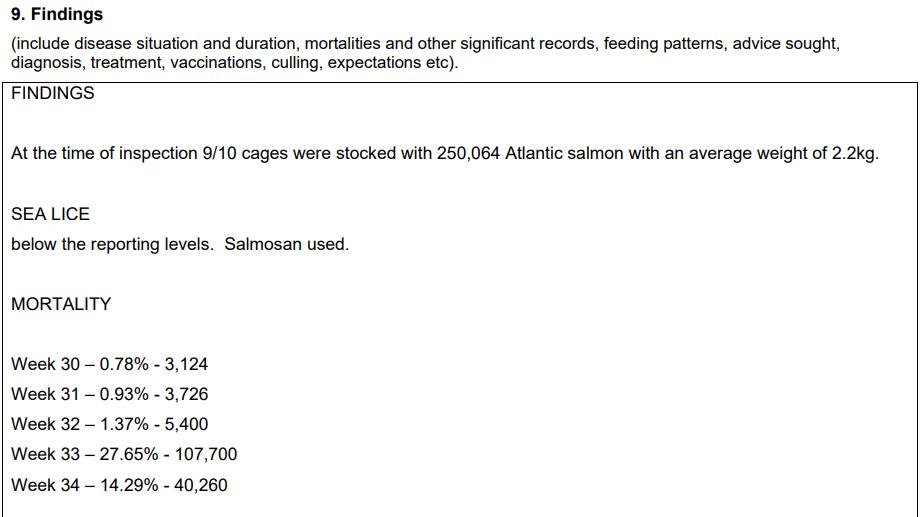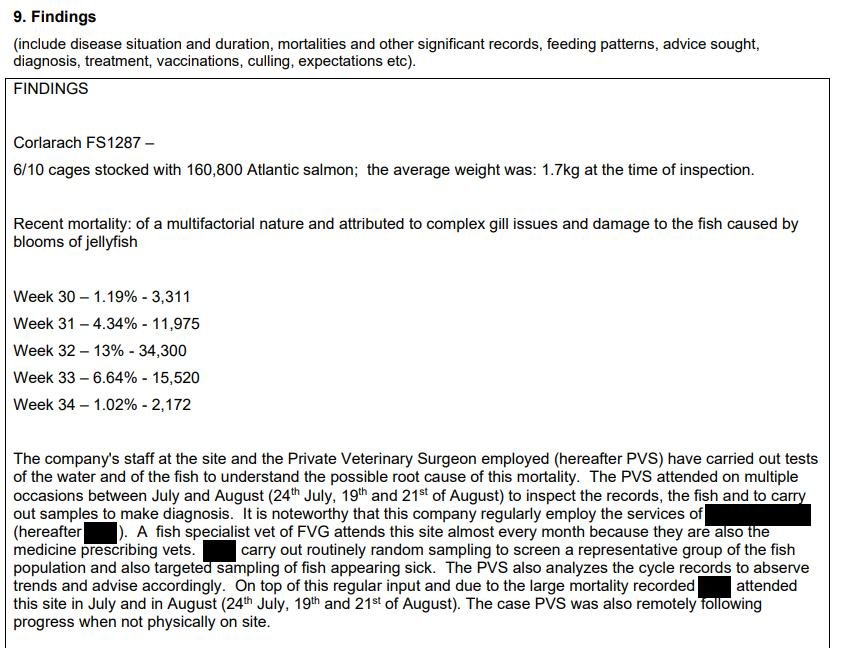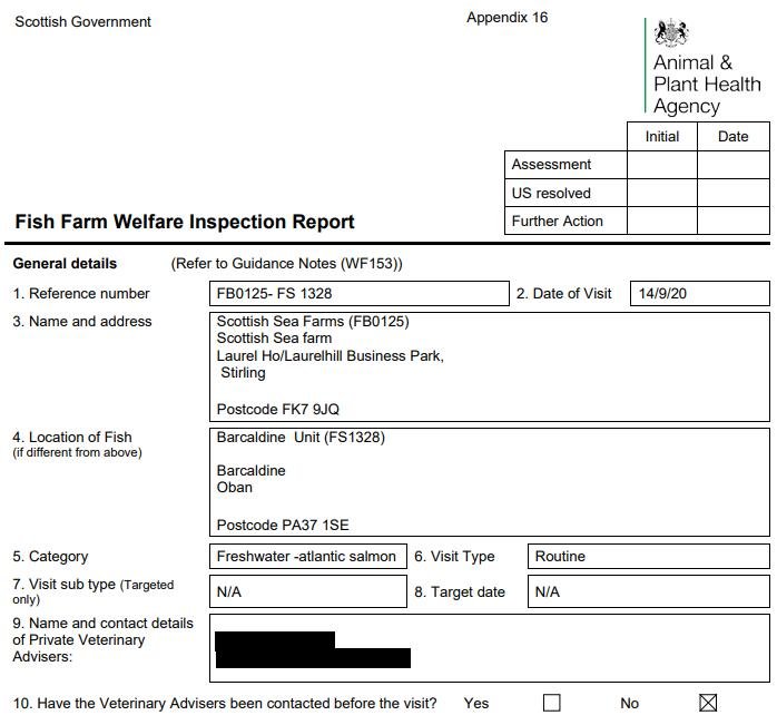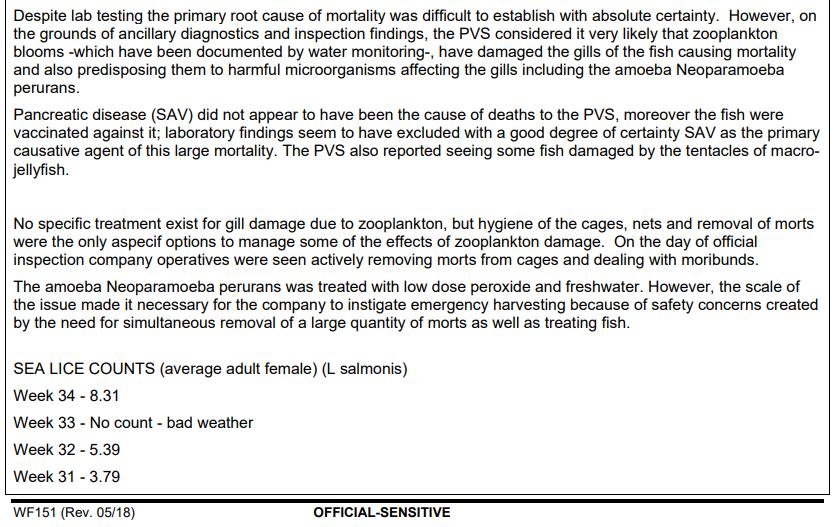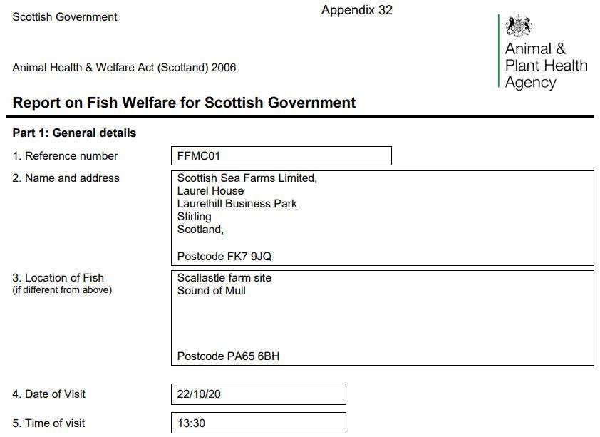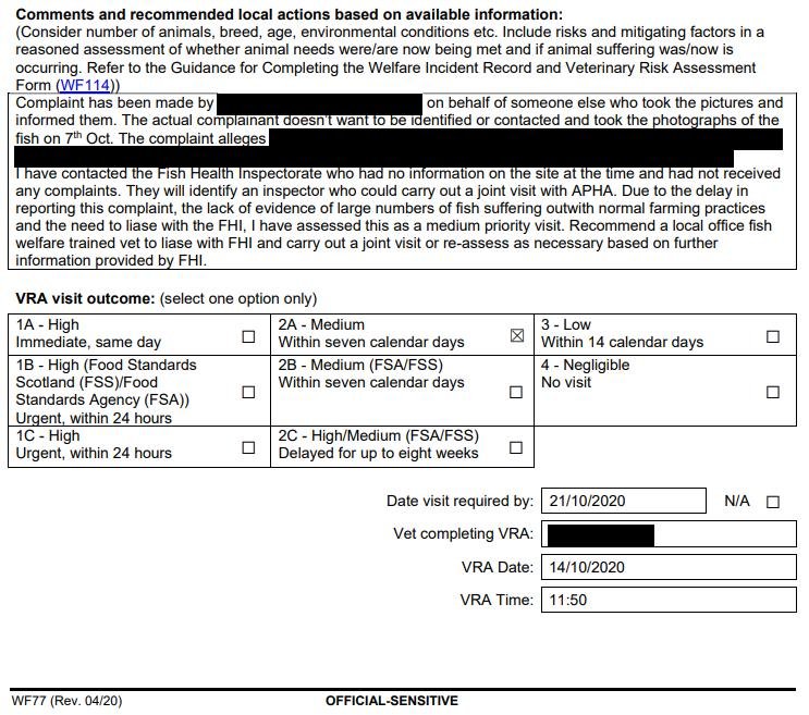 This whole case – and others – do smell decidedly fishy.  Here's APHA's 'Welfare Incident Record & Veterinary Assessment' dated 13 October 2020 for Scallastle Bay salmon farm (Scottish Sea Farms).