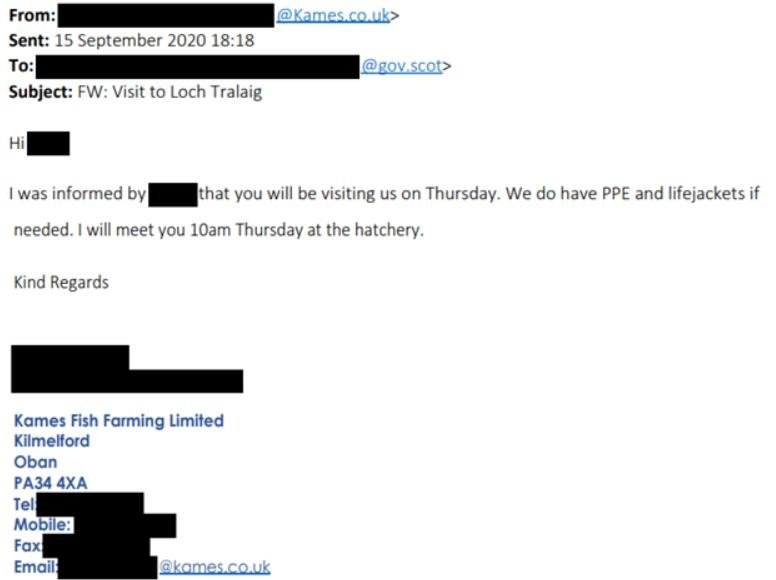 The day after the complaint was filed by Scottish Salmon Watch, it seems that Kames had been tipped off about APHA's joint inspection visit with the Scottish Government's Fish Health Inspectorate.