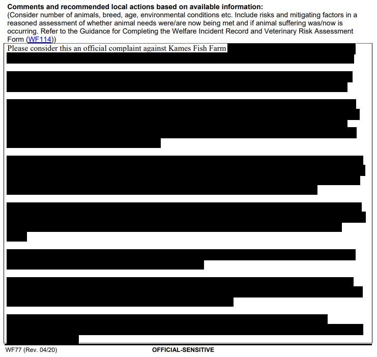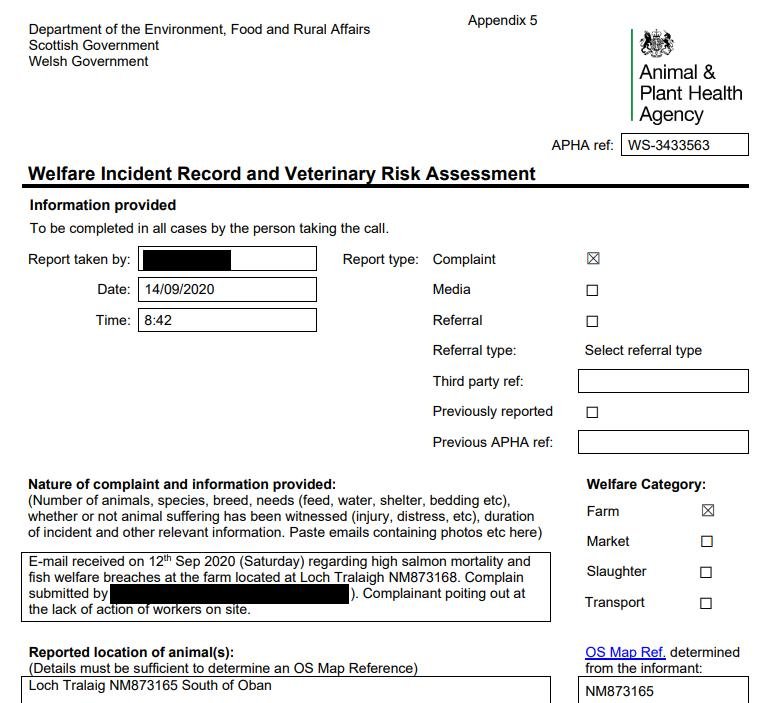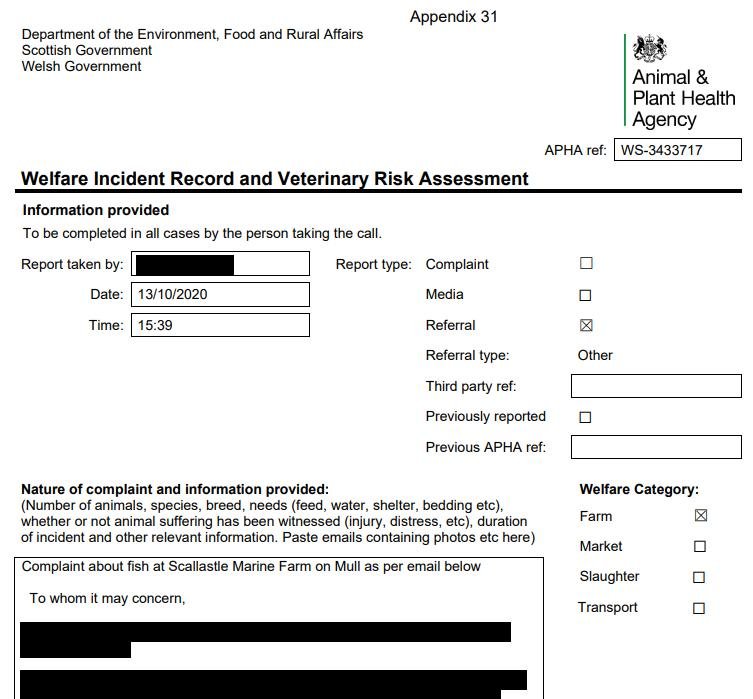 APHA's heavily censored FOI disclosure (13 April 2021) included a welfare complaint filed appropriately on Halloween last year.  The complaint regarding an "urgent animal welfare issue" has been redacted along with what is understood to be video footage and/or photographic evidence of welfare abuse at Scottish Sea Farms in Loch Creran (a salmon farm accredited via RSPCA Assured and sold via M&S as "responsibly sourced").