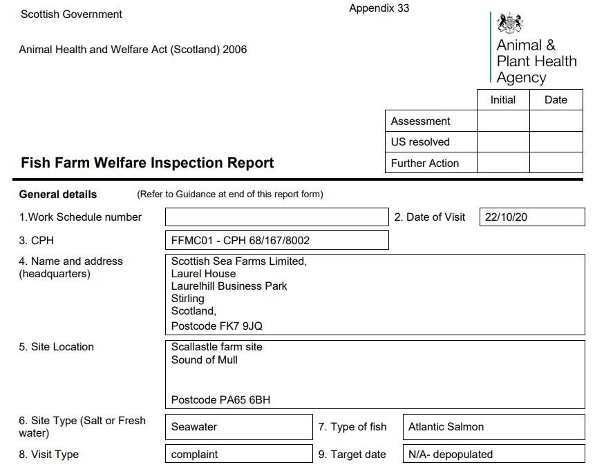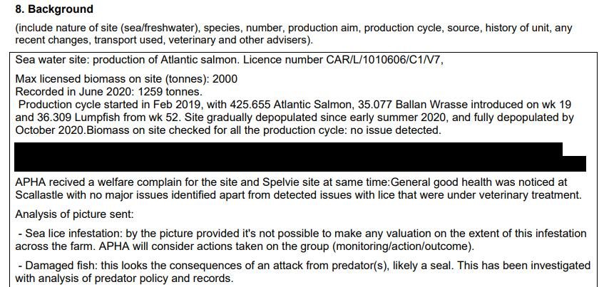 A 'Fish Farm Welfare Inspection Report' for Scallastle Bay – which again cites another welfare complaint regarding Loch Spelve (again spelt incorrectly) details how APHA's 'inspection' of RSPCA Assured Scottish Sea Farms involved zero fish since the farm had been depopulated (i.e. all the evidence had been taken away) and the site was therefore "empty at the time of the inspection".  The report referred to photos of lice infestation but did not include them and stated that "by the picture provided it's not possible to make any valuation on the extent of this infestation across the farm".  Another picture of a damaged fish was attributed to a seal attack and was "investigated with analysis of predator policy and records".