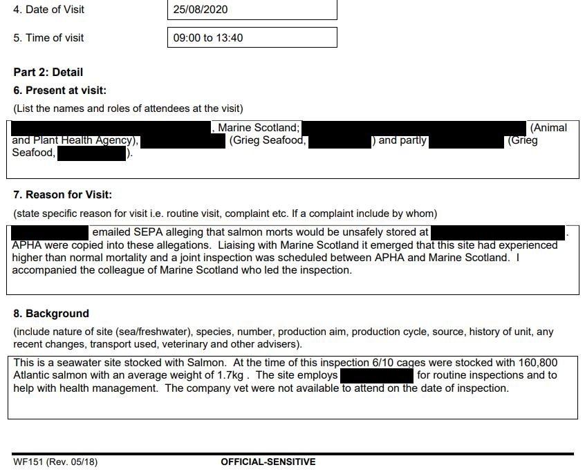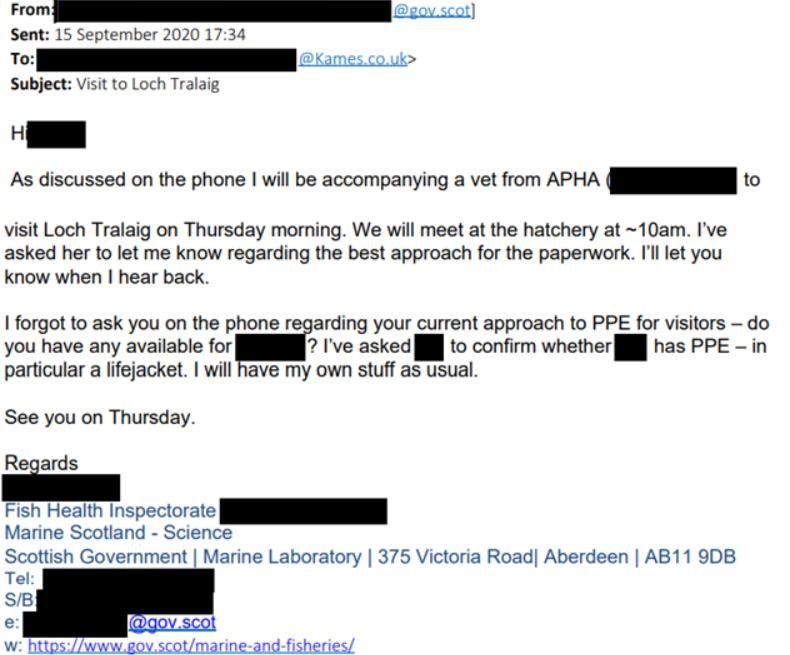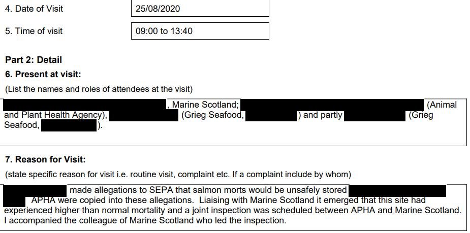 It seems that salmon farming companies are aware of APHA 'inspections' in advance.   In another case disclosed by APHA via FOI, it seems that the head veterinarian at Scottish Sea Farms (who was appointed chair of the SSPCA in 2018) was aware of a "possible APHA visit" to his Scallastle Bay salmon farm beforehand.
