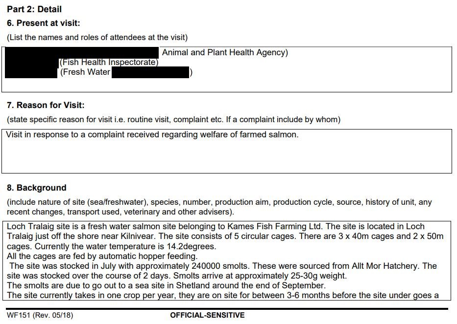 Another 'Fish Farm Inspection Report' marked "Official-Sensitive" detailed how APHA inspected 70% of 200,100 fish at the RSPCA Assured Loch Tralaig salmon farm in September 2020.