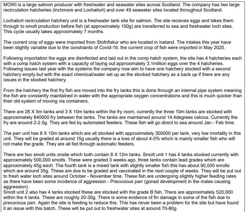 The FOI disclosure by APHA to Scottish Salmon Watch on 13 April 2021 also gives a glimpse into how super-speedy the 'inspectors' work.  A 'Fish Farm Welfare Inspection Report' of the Barcaldine Smolt Unit operated by Scottish Sea Farms dated 14 September 2020 details how APHA inspected 1,597,623 farmed salmon – that's bloody good going for a day's work (and may explain why APHA didn't have time to take any photos).  Even more impressive, APHA reported that every single one of the 1,597,623 fish 'inspected' at the Barcaldine facility was "compliant".