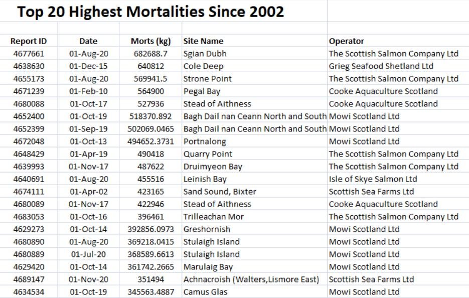Six out of the top twenty monthly mortalities since 2002 when data was made available were reported during 2020 – with The Scottish Salmon Company's salmon farm at Sgian Dubh in Loch Striven in August 2020 heading the list of shame.